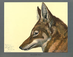 This is a long-legged and slender-snouted canine found only the mountains of Abyssinia. Although foxlike in its color, it is wolflike in habits, at least to the extent of going in small packs. It subsists mainly on small rodents. Painted from life by Louis Agassiz Fuertes. No. 29 Album of Abyssinian Birds and Mammals.