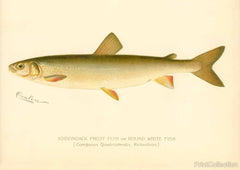 Adirondack Frost Fish or Round White Fish. (Coregonus Quadrilateralis, Richardson.)Created by artist S. F. Denton (Sherman Foote) born in 1856 and died in 1937 Well known for his exquisite drawings of fish, birds, and mammals when he was commissioned for several years to illustrate the New York State Fish and Wildlife Annual Report, part of the Forest, Fish and Game Commission of New York State.
