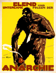Elend und Untergang folgen der Anarchie. Created by J.U. Engelhard in 1918, Published in MÌÎ_nchen : Kunstanstalt O. Consí©e at 106 x 90 cm. Poster shows a monster, an anarchist(?), holding a knife and a bomb. Text: Misery and destruction follows anarchy.
