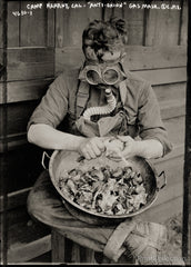 Camp Kearny, California "Anti-Onion" gas mask. WWI Gas Masks displayed for the camera. Photographed on 5x7 glass plate negative by the Bain News Service.