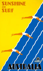 Poster promoting Australia - Sunshine and Surf created by Gert Sellheim around 1930.Created in Melbourne by the Australian National Travel Association, as a color lithograph, color at 102 x 63 cm. Poster shows three women diving into water.
