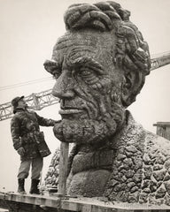 Over-sized bust sculpture of Abraham Lincoln, with man in coat standing beside the sculpture photographed in 1959.