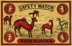 Camel Safety Match made in Japan shows several camels of Red and white with 4 human busts in the corners.