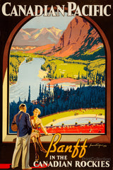 Poster shows a view of Lake Louise at Banff National Park. In foreground a man and woman near a wall overlooking tennis courts and a swimming pool.