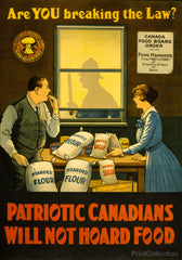 Are you breaking the law? Patriotic Canadians will not hoard food. Sponsored by the Canada Food Board. Published during World War I by Hamilton, Ontario, Canada and printed by Howell Litho. Original size at 63x46 cm.