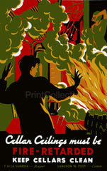Cellar ceilings must be fire-retarded, Keep cellars clean. Health & Safety poster created by Martin Weitzman for the New York: Federal Art Project in 1936 or 1937 as a color silkscreen. Summary: Poster promoting use of fire retardant materials in home construction, showing a couple trapped in burning house. Work Projects Administration Poster. F.H. La Guardia, Mayor - Langdon W. Post, Commissioner.