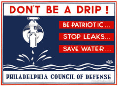 Don't be a drip! Be patriotic ... Stop leaks ... Save water. Created by Charlotte Angus for the Federal Art Project Pennsylvania Art WPA in 1943 as a color silkscreen.
