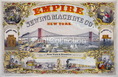 Empire Sewing Machine Co., New York. Printed by Henry Seibert & Bros., general lithographers and power press printers, N.Y. in 1870. Views of New York & Brooklyn Suspension Bridge, sewing machines, people sewing by hand and with sewing machines, and transportation by stagecoach and railroad train.