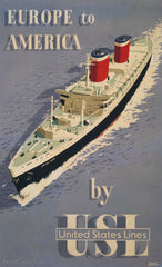 Europe to America by United States Lines and artist John S. Smith. Created and published in 1955 as a color lithograph at 106 x 65 cm.