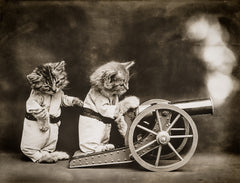 Fire!, photographed by Harry Whittier Frees, June 24, 1914. Photograph shows two kittens wearing clothes firing a cannon.