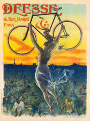 Poster shows semi-nude goddess in flight holding bicycle above crowd of bicyclists from all over the world.