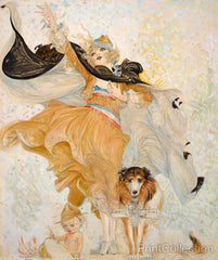 Golden Eyes with Uncle Sam. Created by Nell Brinkley in 1918 in watercolor, ink, gouache, and opaque white over graphite underdrawing. Illustration shows a young woman, "Golden Eyes," dressed in a khaki-colored dress and cap standing with a collie dog named Uncle Sam who holds a "Liberty bond" on his collar. A nude kewpie-like figure bangs a drum lower left. Their act of patriotism supported American soldiers during World War I.