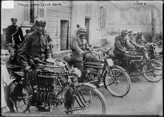 This photo taken in the early 1900's in Italy, shows policemen with their motorbikes, looking to camera. Image taken by the Bain News Service.