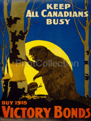 Keep All Canadians Busy. Buy 1918 Victory Bonds. Created in 1918 as a color lithograph at 60 x 45 cm. Poster shows beavers chewing on a tree.