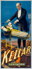 Kellar on tour promotion his Levitation number. Original color lithograph at 213 x 101 cm. Created by the Strobrodge Litho, Co. of Cincinnati and New York in 1900.