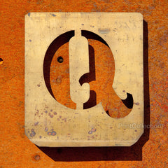 This letter "Q" is but one of a very large collection of metal type stencils for labeling business packaging. Dates back to the 1940?s. Photographed here on a beautifully rusted steel sheet.