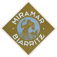Luggage Label for the Miramar Biarritz luggage label with topless mermaid brushing her hair. Printed by Richard A. Co. Paris.