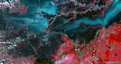 Since July 2011, heavy monsoon rains in southeast Asia have resulted in catastrophic flooding. In Thailand, about one third of all provinces are affected. On Oct. 23, 2011, when this image from ASTER, the Advanced Spaceborne Thermal Emission and Reflection Radiometer instrument on NASA's Terra spacecraft was acquired, flood waters were approaching the capital city of Bangkok as the Ayutthaya River overflowed its banks. In this image, vegetation is displayed in red, and flooded areas are black and dark blue. Brighter blue shows sediment-laden water, and gray areas are houses, buildings and roads. The image covers an area of 35.2 by 66.3 miles (56.7 by 106.9 kilometers) and is located at 14.5 degrees north latitude, 100.5 degrees east longitude.