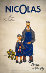Poster showing "Nectar," a fictional delivery man for the Nicolas wine merchant firm, and his little helper "Glou-glou," who holds many bottles.