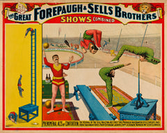 The Great Forepaugh & Sells Brothers shows combined. Phenomenal Acts of Contortion created in 1899 as a chromolithograph at 101 x 80 cm. Circus poster showing a juggler, and contortionists performing various acts including backward dives from an extension ladder.Created by the Strobridge Litho. Co., Cincinnati & New York.