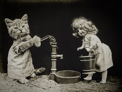 Pumping Water, photographed by Harry Whittier Frees, June 24, 1914. Photograph shows a kitten wearing clothes and pumping water for a doll.