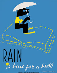 Rain is Bad for a Book! Created by the artist Arlington Gregg for the Works Progress Administration, Chicago, IL. Made by Illinois W.P.A. Art Project, between 1936 and 1940 as a color silkscreen silkscreen at 35.6 x 28 cm. WPA poster shows a boy with an umbrella sitting on an open book.