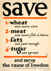 Text poster created during WWI encouraging Americans to Save and Serve the Cause of Freedom, including 1. Wheat - use more corn 2. Meat - use more fish and beans 3. Fats - use just enough 4. Sugar - use syrups.