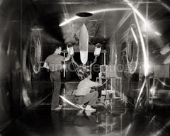 Engineers Check Body Revolution Model at the NASA, Glenn Research Center, 07/31/1957. In their socks, engineers are making a check on body of a model of a supersonic aircraft before a test run in the 10ft x 10ft Supersonic Wind Tunnel test section.