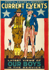 Special Edition of Universal Current Events Latest Views of our Boys in the Service by J. Carl Mueller. Published between 1916 to 1918 by The Hegeman Print as a chromolithograph.Summary: Poster showing Uncle Sam standing next to a soldier, each with an arm on the other's shoulders.