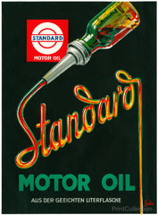 Standard Motor Oil advertisement showing a glass liter bottle flowing into the word "Standard". Poster designed by Johannes Safis in 1928.