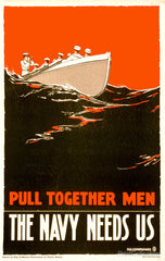 "Pull together men - The Navy needs us!", poster created by Paul Boomhower in 1917 showing sailors rowing a boat for World War I. Originally it was produced as a color lithograph - innovative use of color.
