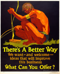 There's a better way. We want -- and welcome -- ideas that will improve this business What can you offer? Created by artist Willard Frederic Elmes for Mather & Company, Chicago, 1929 at 108 x 88 cm.Summary: Poster shows a Native American man starting a fire.