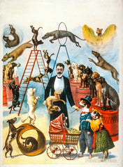 Created by the Courier Litho Co. out of Buffalo, NY in 1899 this image of a trained dog act features a theatrical production of animals in human situations. It was originally produced as a color lithograph poster.