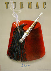 Advertising poster for Turmac Bleu cigarettes with cigarette in cigarette holder resting on a fez.