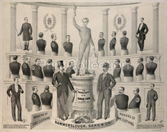 The various shapes of the human form that we provide for. Print shows nineteen different male body shapes illustrating the range of clothing the advertiser, Hammerslough, Saks & Co., can accommodate. Lithograph created c1890 and printed by Sackett & Wilhelms Litho. Co.