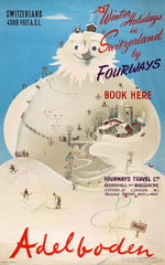 Travel Poster by Herbert Leupin created in the 1940's. Original color lithograph was created at 101 x 63.5 cm. Poster for Switzerland showing a mountain in the shape of a snowman with people skiing, sledding, and sleigh-riding.