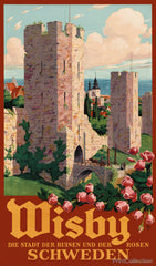 Wisby Der Stadt der Ruinen und der Rosen Schweden color lithograph poster, originally 100 x 62cm, made in the 1930's by Ivar Gull, Stockholm, Centraltryckeriet