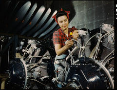 Woman Working on an Airplane Motor at North American Aviation, Inc., plant in California. Photographed by Alfred Palmer for the WPA in June of 1942. Shot on color 4x5 transparency film.